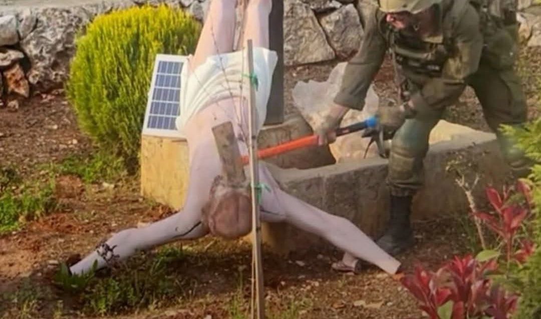 An image which widely circulated online on Sunday shows a soldier from ‘Israel’ destroying a statue of Jesus Christ in a village in southern Lebanon.